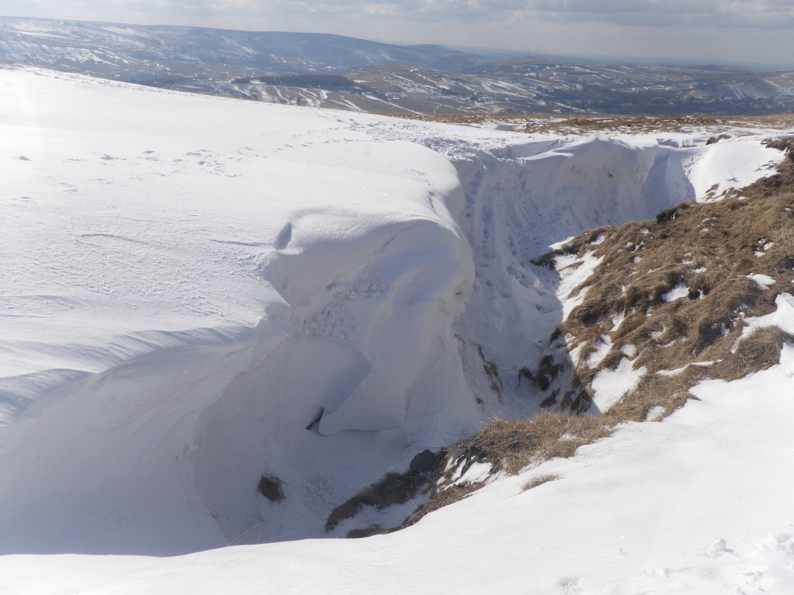 With a cold wind now blowing head-on the temperature dropped again and rucksacks and cags became encrusted in a layer of frost. My water bottle had frozen and I couldn’t open the valve to access the solidifying solution within. The traverse across Harden Moss to Swains Head passed by with relative ease, although both Roy and I did break through a frozen bog together and ended up knee deep in its freezing cold contents.